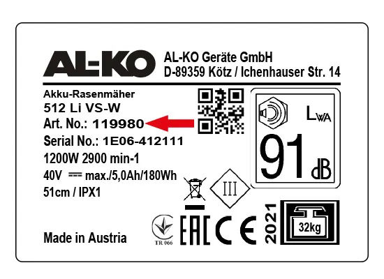 Výrobné číslo je u značky AL-KO označené ako - "Artiklové číslo: