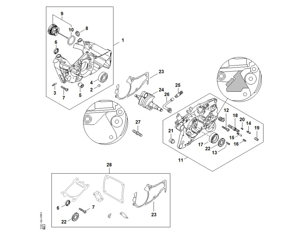MS 500i / A - kľuková skriňa / Náhradný diel číslo: 11, Polovica kľukovej skrine, obsahuje diely č.: 12,13,14,15,16,17,18,19,20,21,22