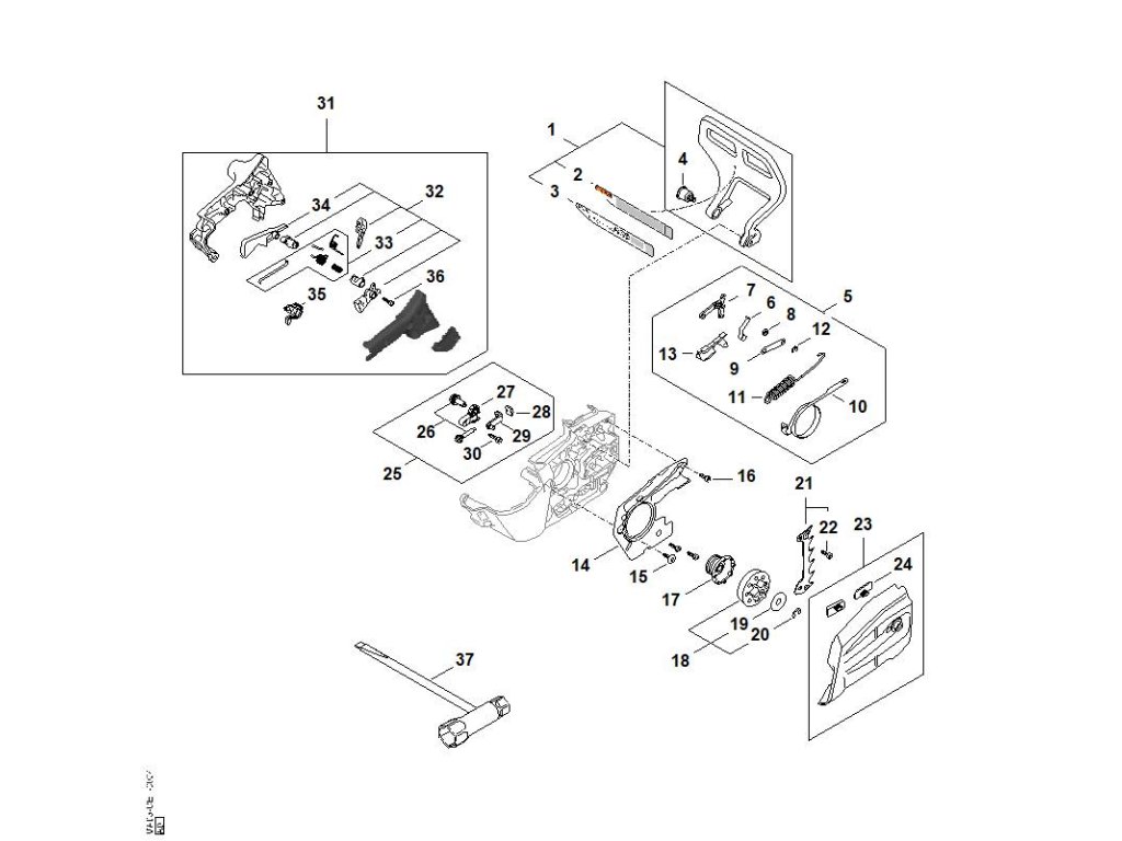 MSA 190.0 T / B - ochrana ruky, teleso rukoväte, reťazové koleso, kryt reťazového kolesa / Náhradný diel číslo: 31, Teleso rukoväte, obsahuje diely č.: 32,33,34,35