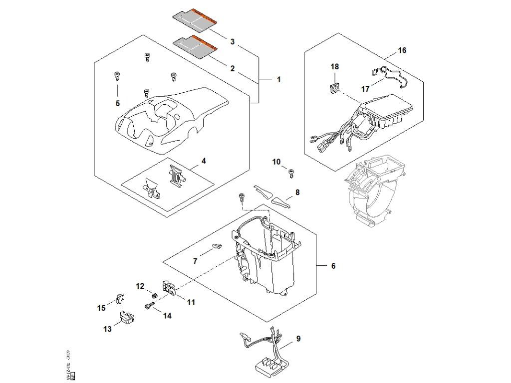 MSA 300.1 C-O / B - priestor pre akumulátor, elektronický modul / Náhradný diel číslo: 16, Elektronický modul, obsahuje diely č.: 17,18