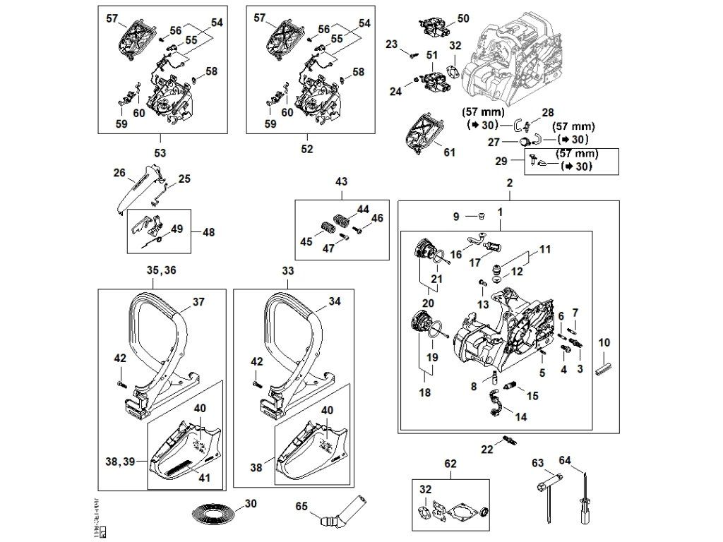 MS 212 / Blok motora, vzduchový filter, antivibračný systém, rúrková rukoväť / Náhradný diel číslo: 62, Súprava tesnenia, obsahuje diely č.: 32