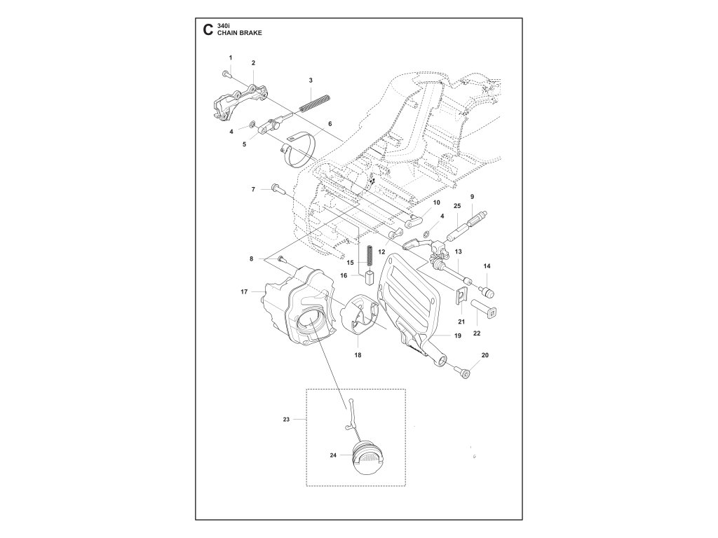 340i bez akumulátora a nabíjačky / Brzda reťaze / Náhradný diel číslo: 23, UZÁVER NÁDRŽE - ZOSTAVA