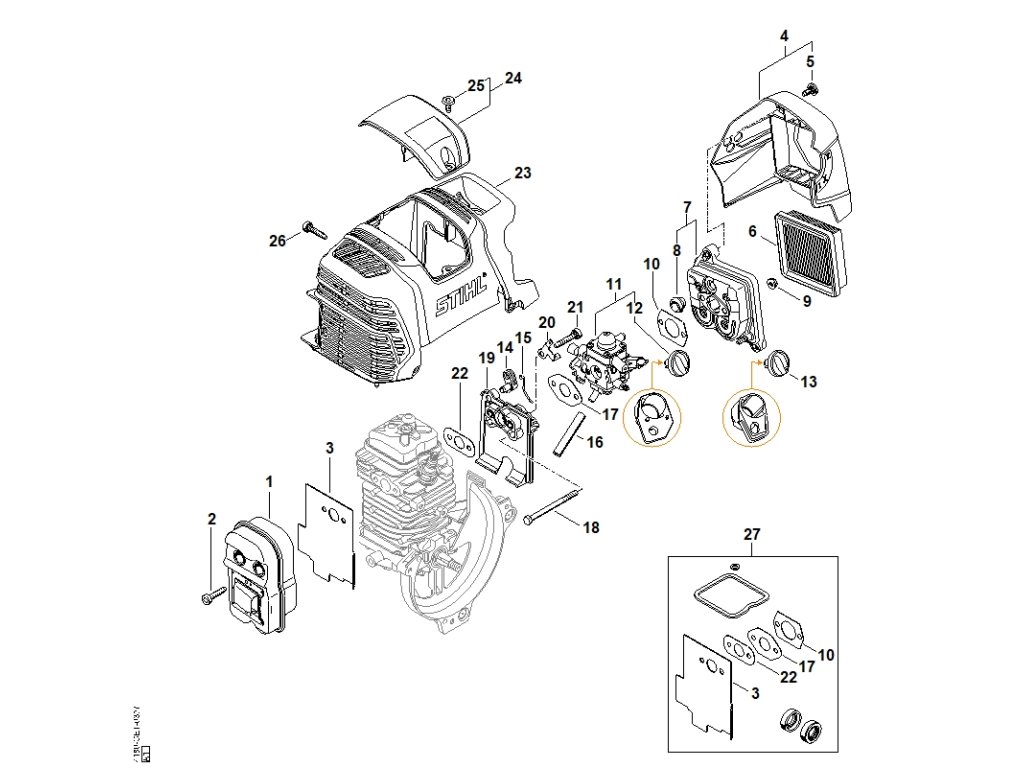 FS 89 / C - tlmič výfuku, vzduchový filter / Náhradný diel číslo: 11, Karburátor 4180/18, obsahuje diely č.: 12