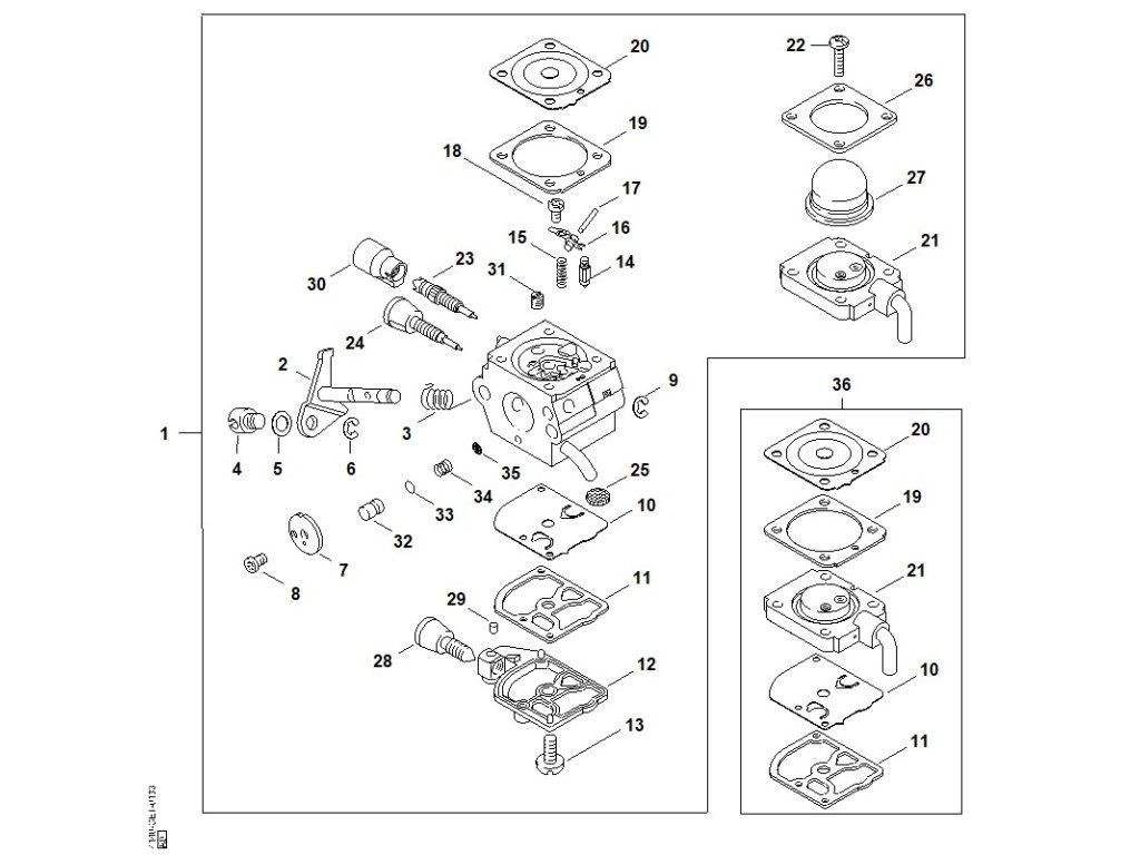 FS 45 C-E / Ab - karburátor c1q-s71 (25.2004) / Náhradný diel číslo: 36, Súprava dielov karburátora, obsahuje diely č.: 10,11,19,20,21