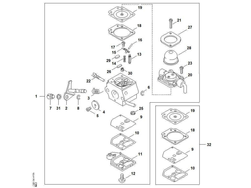 FS 45 / Ad - karburátor c1q-s58 (27.2001) / Náhradný diel číslo: 32, Súprava dielov karburátora, obsahuje diely č.: 9,10,1819