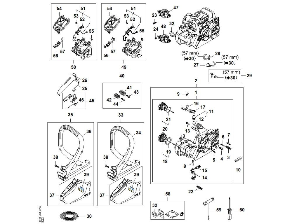 MS 182 / Blok motora, vzduchový filter, antivibračný systém, rúrková rukoväť / Náhradný diel číslo: 60, Skrutkovač