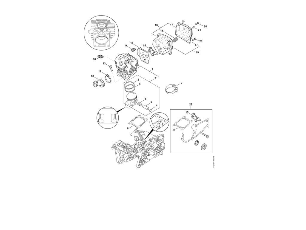 MS 462 / C - valec, tlmič výfuku / Náhradný diel číslo: 1, Valec s piestom Ø 52 mm, obsahuje diely č.: 2,3,4,5,6