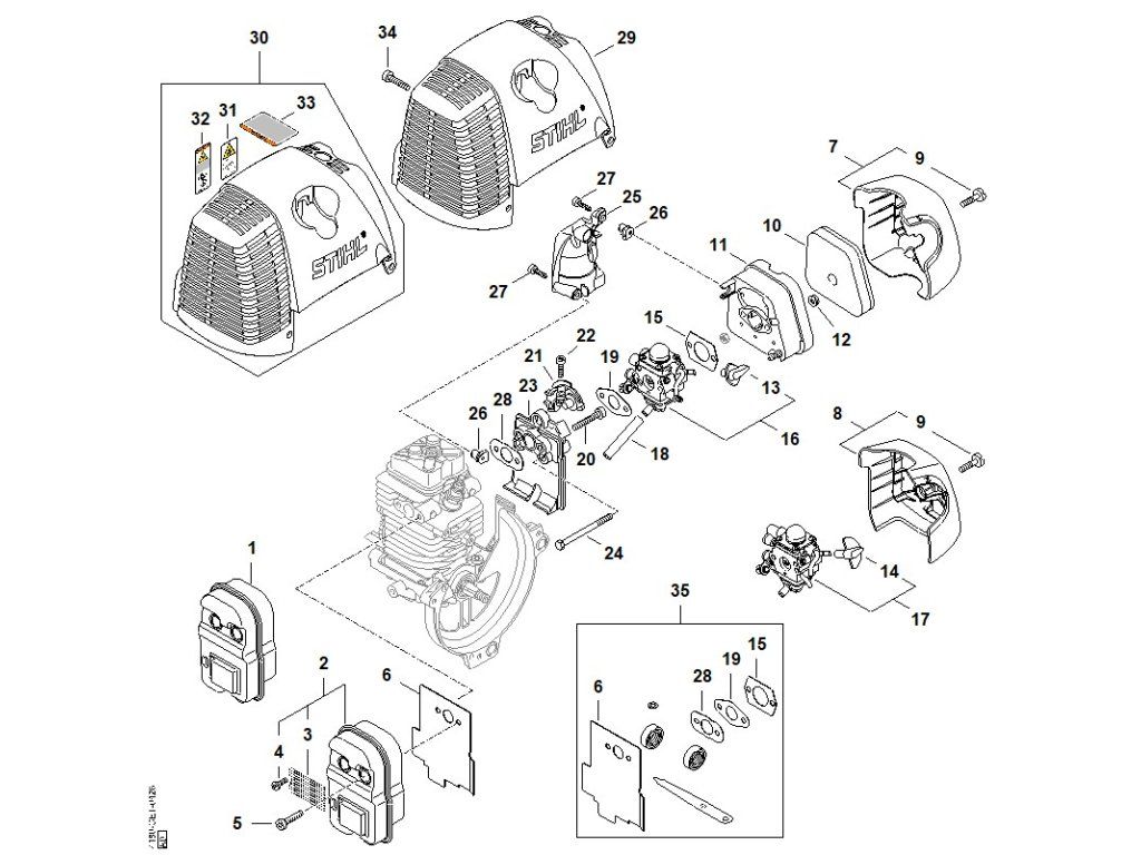 FS 130 / D - tlmič výfuku, vzduchový filter / Náhradný diel číslo: 35, Súprava tesnenia, obsahuje diely č.: 6,15,19,28