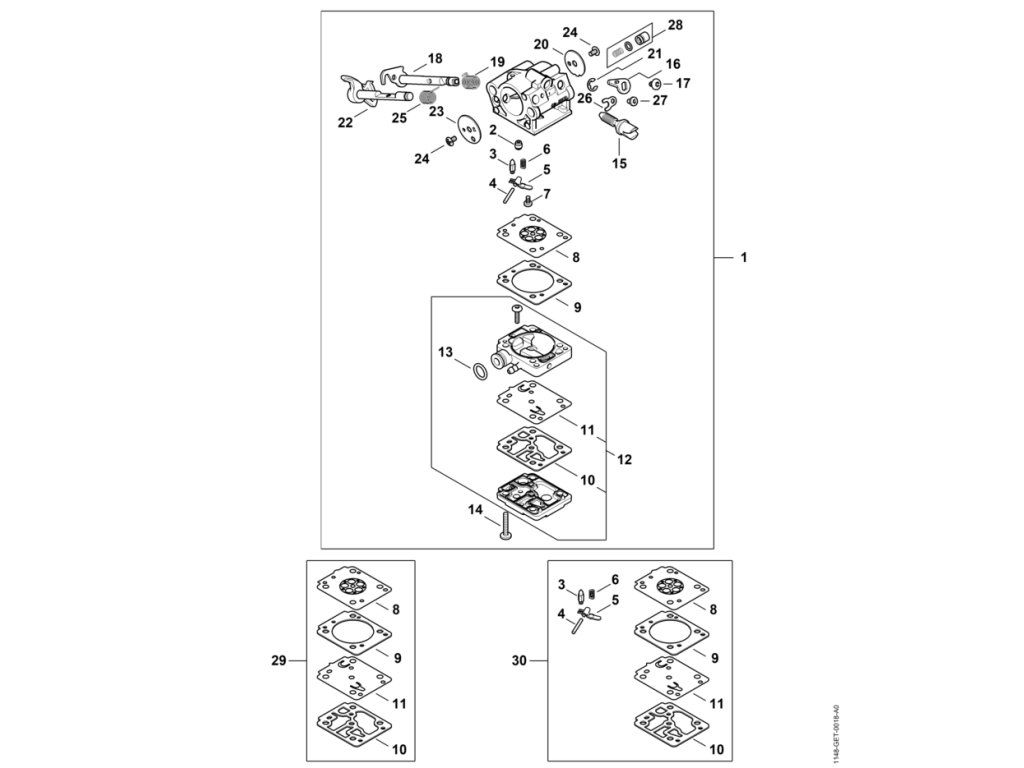 MS 172 / Diely karburátora / Náhradný diel číslo: 1, Karburátor 1148/00, obsahuje diely č.: 2,3,4,5,6,7,8,9,10,11,12,13,14,15,16,17,18,19,20,21,22,23,24,25,26,27,28