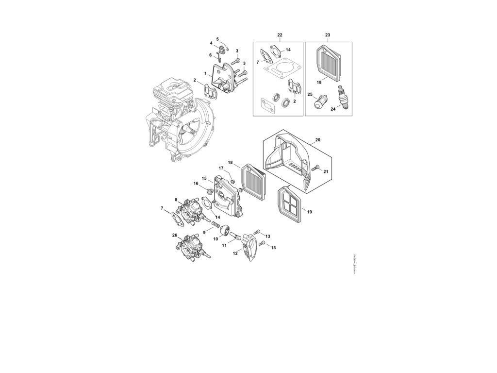 FS 411 C-EM / E - medzipríruba, násada / Náhradný diel číslo: 26, Karburátor 4147/28