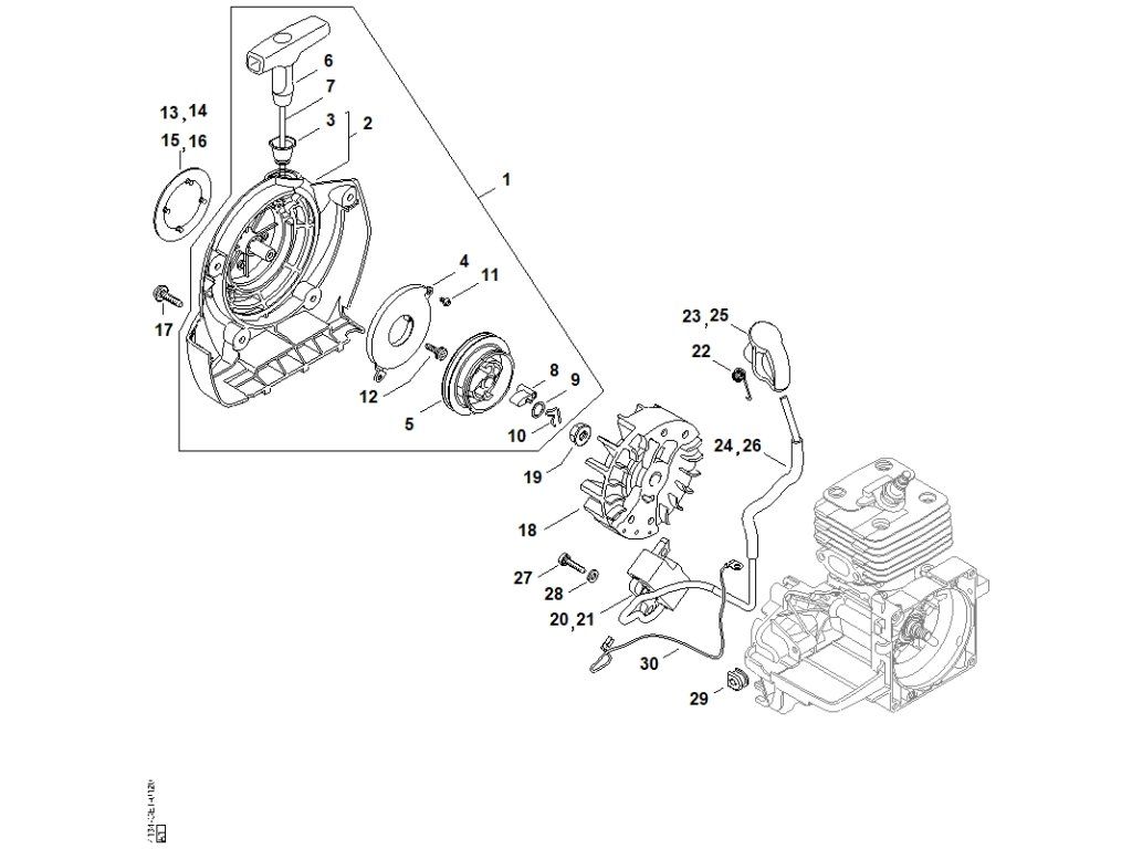 Fs 120 / E - štartovacie zariadenie, zapaľovacia sústava / Náhradný diel číslo: 1, Teleso ventilátora so štartovacím zariad, obsahuje diely č.
