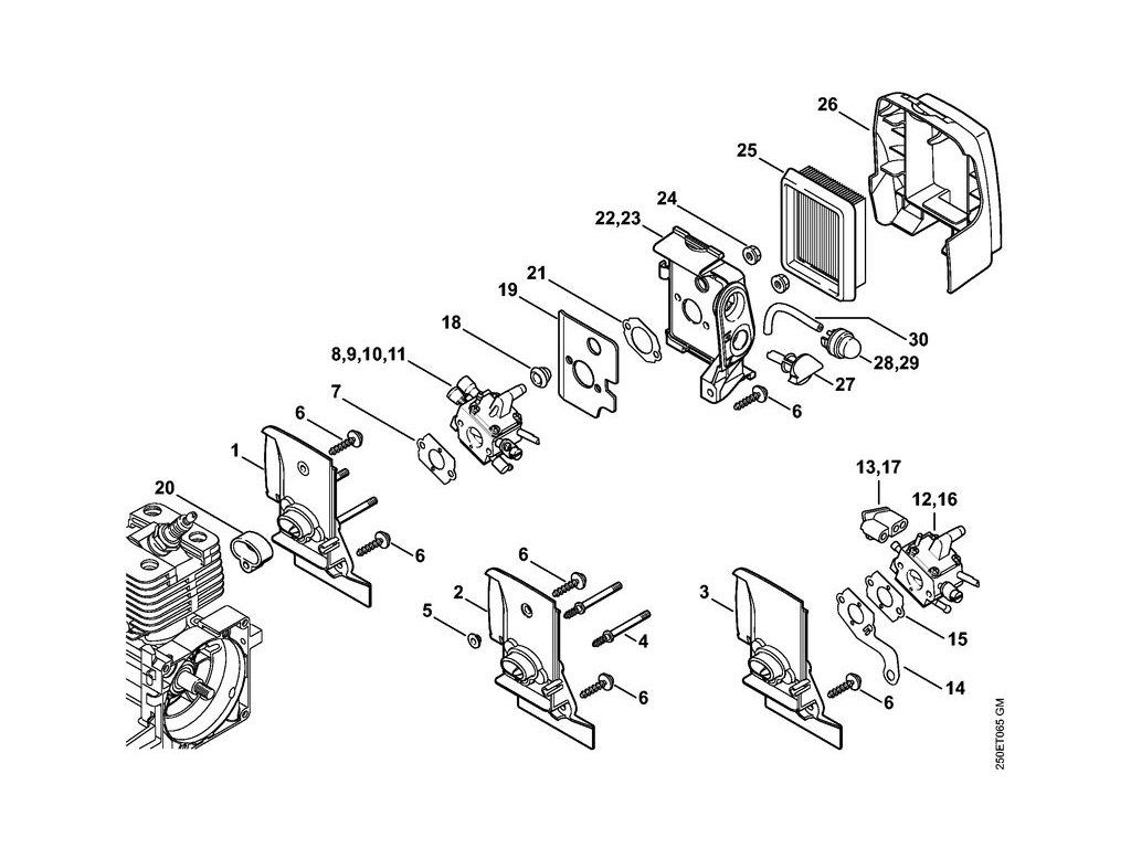 Fs 120 / K - teleso karburátora, vzduchový filter ⇥ 809 249 646 (10. / Náhradný diel číslo: 29, Palivové čerpadlo