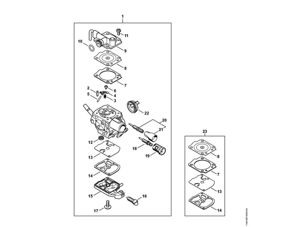MS 151 TC-E / Karburátor 1146/05 / Náhradný diel číslo: 1, Karburátor 1146/05, obsahuje diely č.: 2,3,4,5,6,7,8,9,10,11,12,13,14,15,16,17,18,19,20,21,22