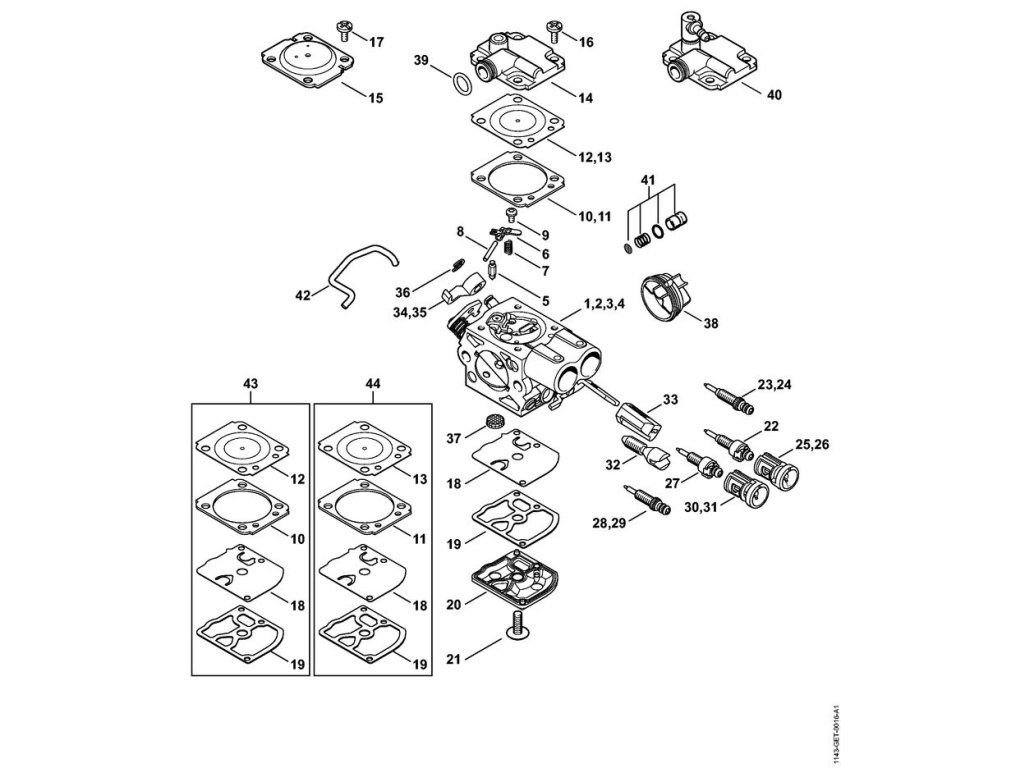 MS 231 C-BE / Karburátor / Náhradný diel číslo: 2, Karburátor 1143/39, obsahuje diely č.: 5,6,7,8,9,10,12,16,18,19,20,21,22,25,27,30,32,33,34,36,37,38,39,40,41,42,43