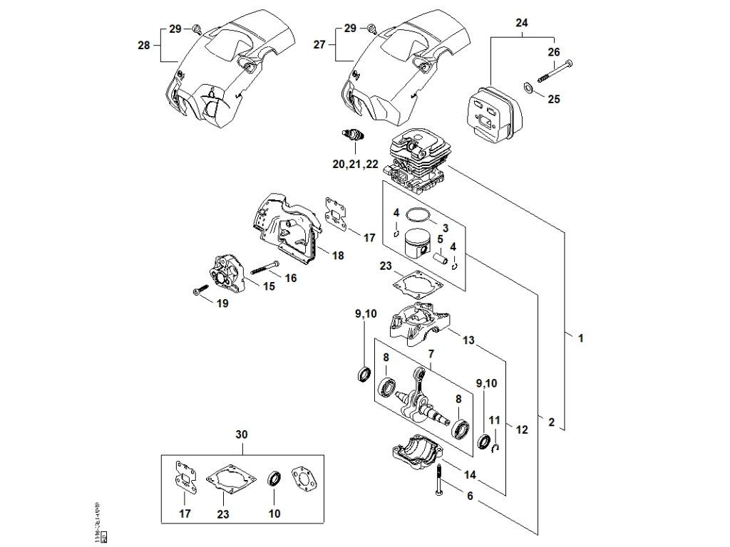 Kľuková skriňa, Valec, Tlmič výfuku, Kryt / Náhradné diely Stihl