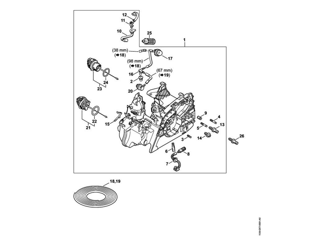 MS 211 C-BE / Kryt motora ergostart / Náhradný diel číslo: 1, Blok motora, obsahuje diely č.: 2,3,4,5,6,7,8,9,10,11,12,13,14,15,16,17,20,21,22,23,24