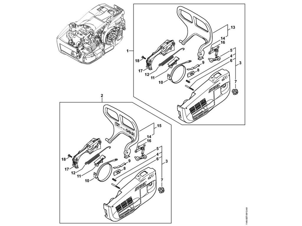 MS 201 TC-M / Kryt reťazového kolesa, ochrana ruky / Náhradný diel číslo: 14, Páčka