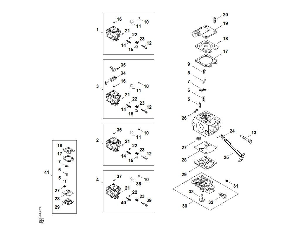 MS 260 / L - karburátor wte-1, wte-2, wte-4, wte-11 / Náhradný diel číslo: 41, Súprava dielov karburátora, obsahuje diely č.: 5,6,7,17,18,27,28,29
