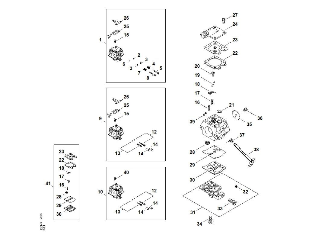 MS 260 / M - karburátor wt-427, wt-581, wt-590 ⇥ 1 62 154 675, 2 62 187 361 (07.2004) / Náhradný diel číslo: 41, Súprava dielov karburátora, obsahuje diely č.: 16,17,18,22,23,28,29,30