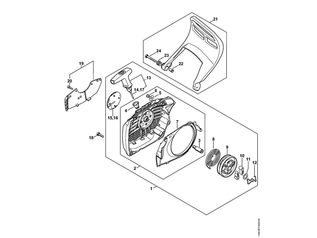 MS 661 C-M / N - štartovacie zariadenie, ochrana ruky / Náhradný diel číslo: 21, Ochrana ruky, obsahuje diely č.: 22,23,24