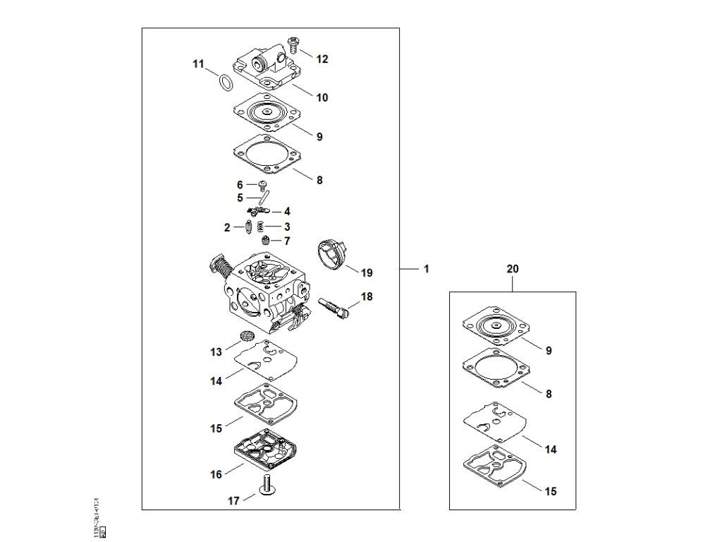 MS 170 2-MIX / P - karburátor c1q-s237 2-mix / Náhradný diel číslo: 1, Karburátor C1Q-S237C (1130/10), obsahuje diely č.: 2,3,4,5,6,7,8,9,10,11,12,13,14,15,16,17,18,19