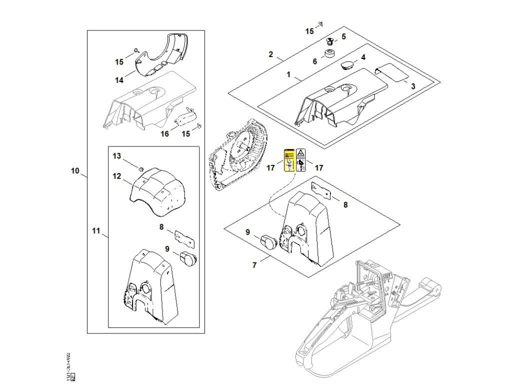 MS 260 / P - kryt, kryt skrine karburátora / Náhradný diel číslo: 10, Súprava, obsahuje diely č.: 8,9,11,12,13,14,15,16
