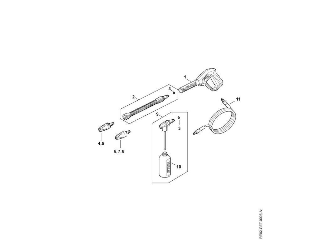 Re 80. / Pištoľ, oceľová rúra / Náhradný diel číslo: 9, Postrekovacia súprava, obsahuje diely č.: 3,10