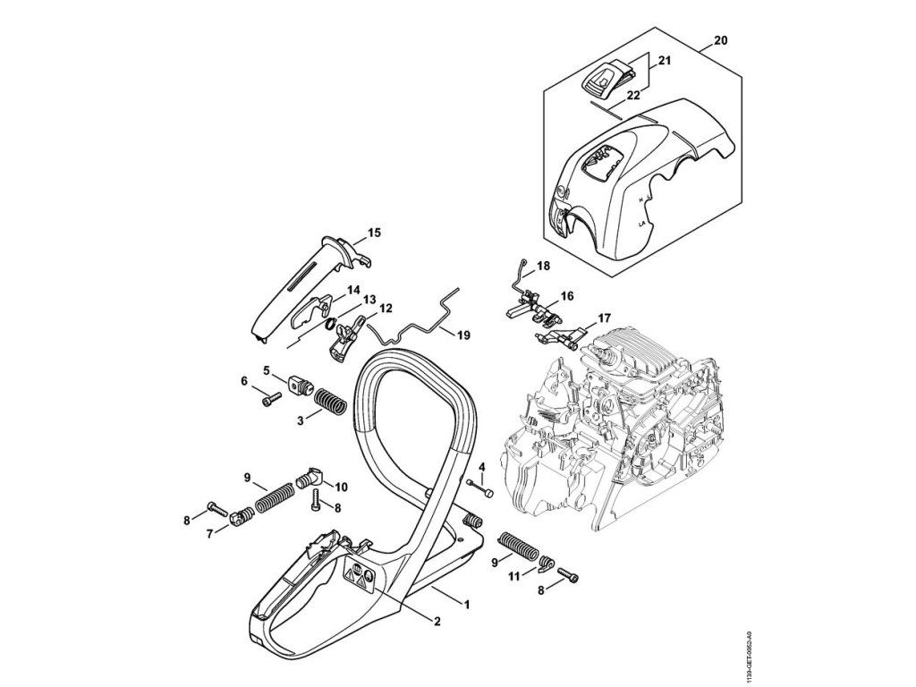 MS 211 C-BE / Rám rukoväte, kryt ms 211 c-be / Náhradný diel číslo: 20, Kryt, obsahuje diely č.: 21,22