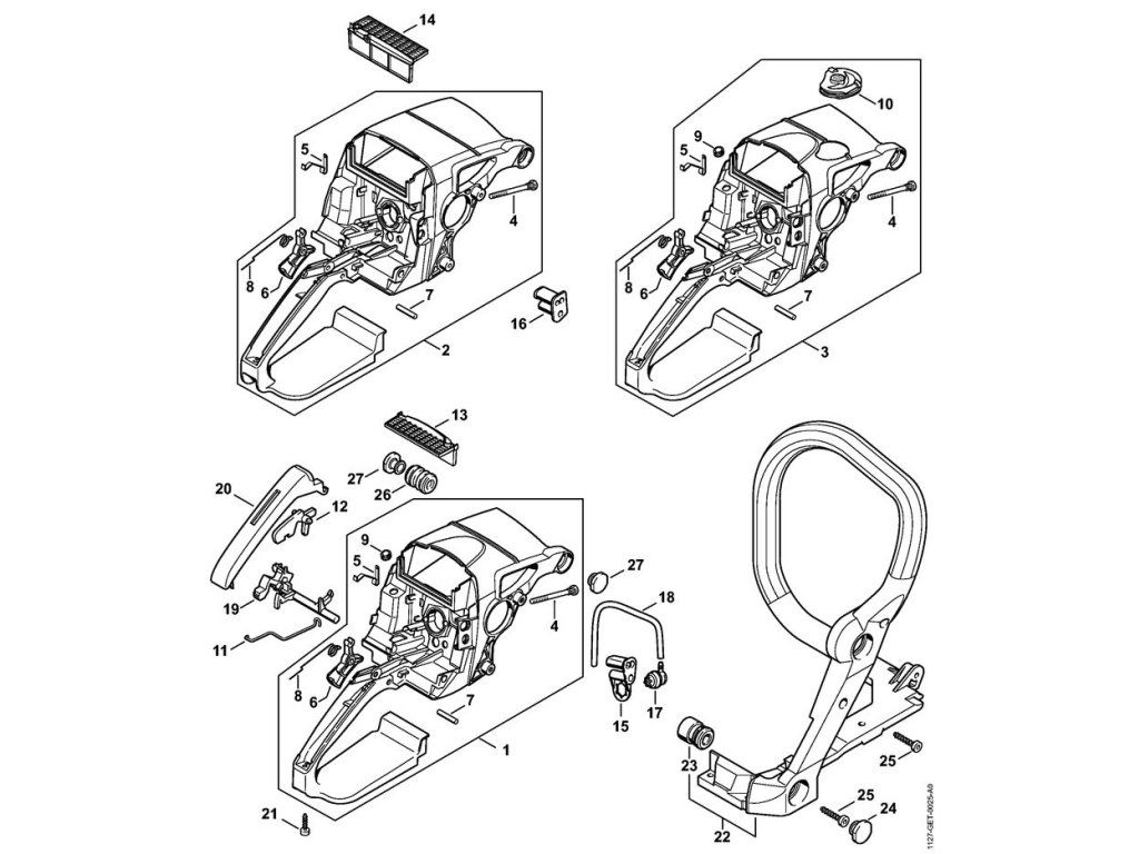 MS 390 / Teleso rukoväte / Náhradný diel číslo: 1, Teleso rukoväte, obsahuje diely č.: 4,5,6,7,8,9