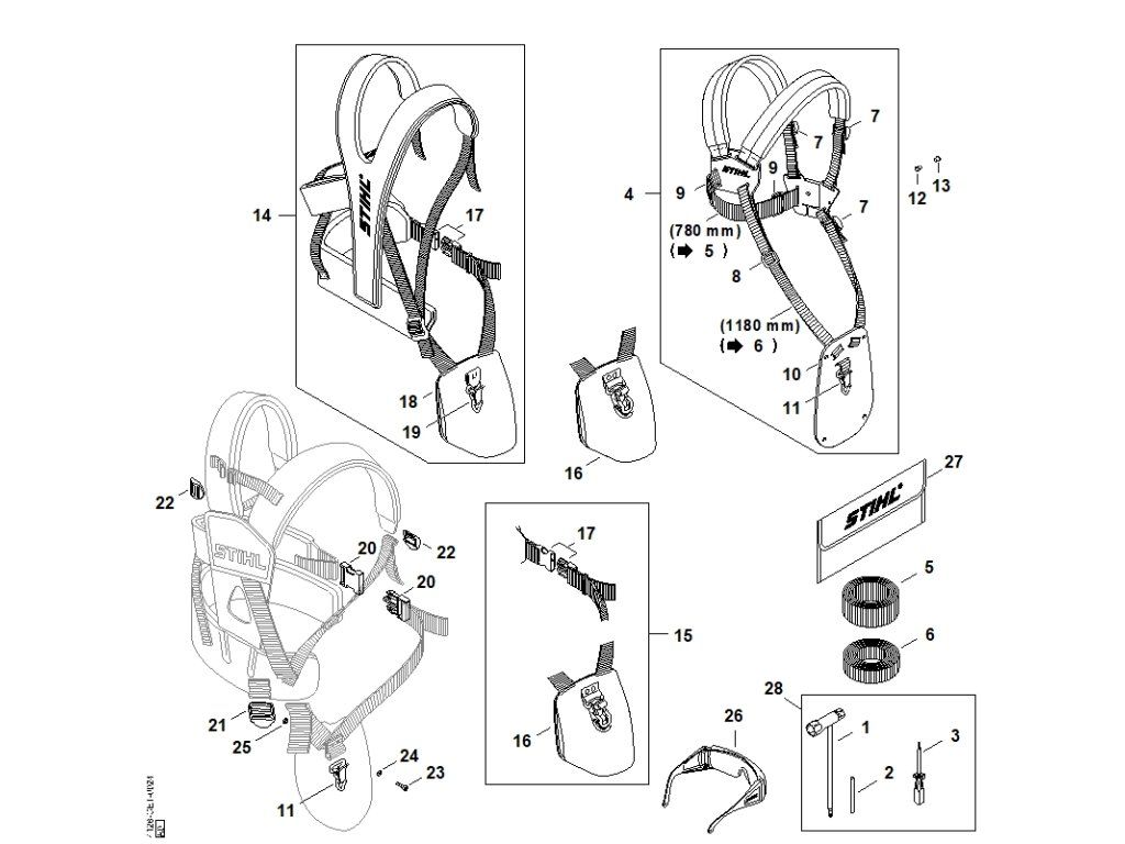 FS 450 / U - náradie, popruh na obe ramená / Náhradný diel číslo: 28, Súprava náradia, obsahuje diely č.: 1,2,3