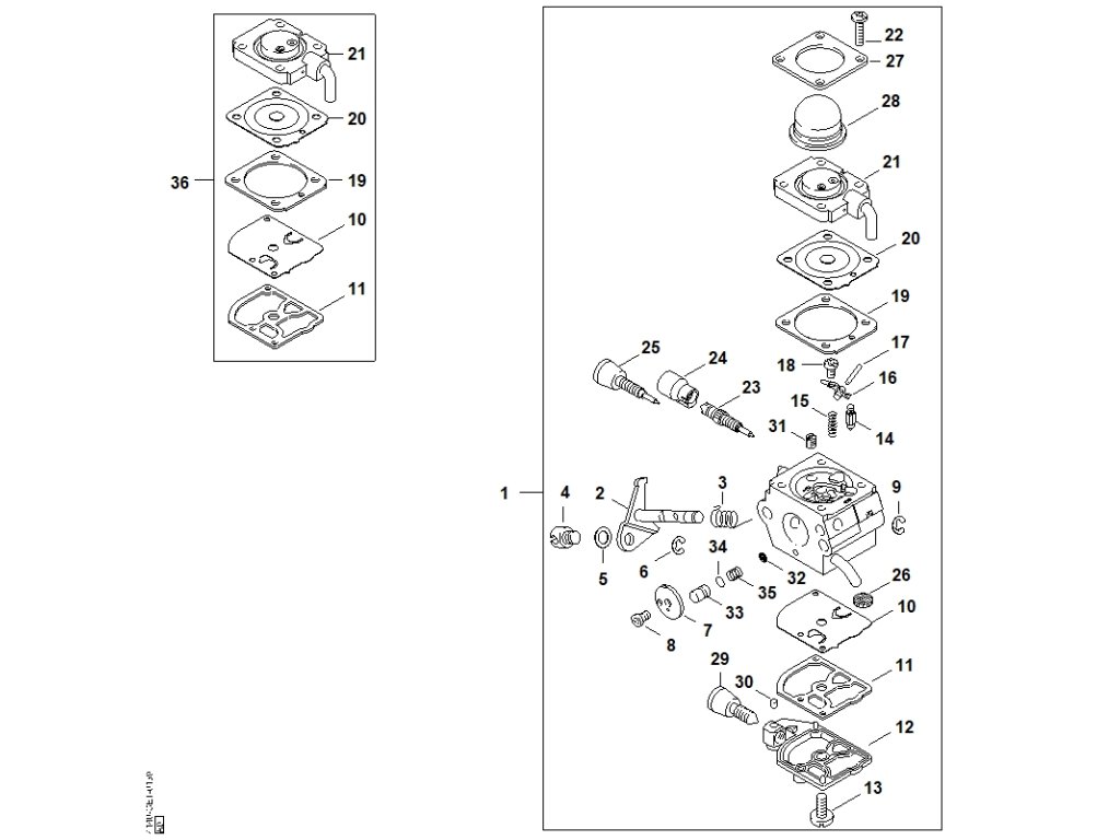 FS 45 C-E / W - karburátor c1q-s97 (16.2014), (46.2012), (29.2010), (15.2009) / Náhradný diel číslo: 36, Súprava dielov karburátora, obsahuje diely č.: 10,11,19,20,21