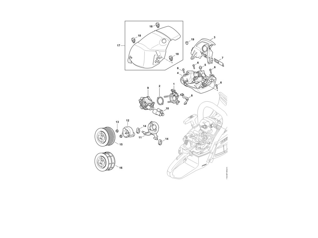 MS 462 / W - nosič karburátora, vzduchový filter, kryt / Náhradný diel číslo: 16, Vzduchový filter