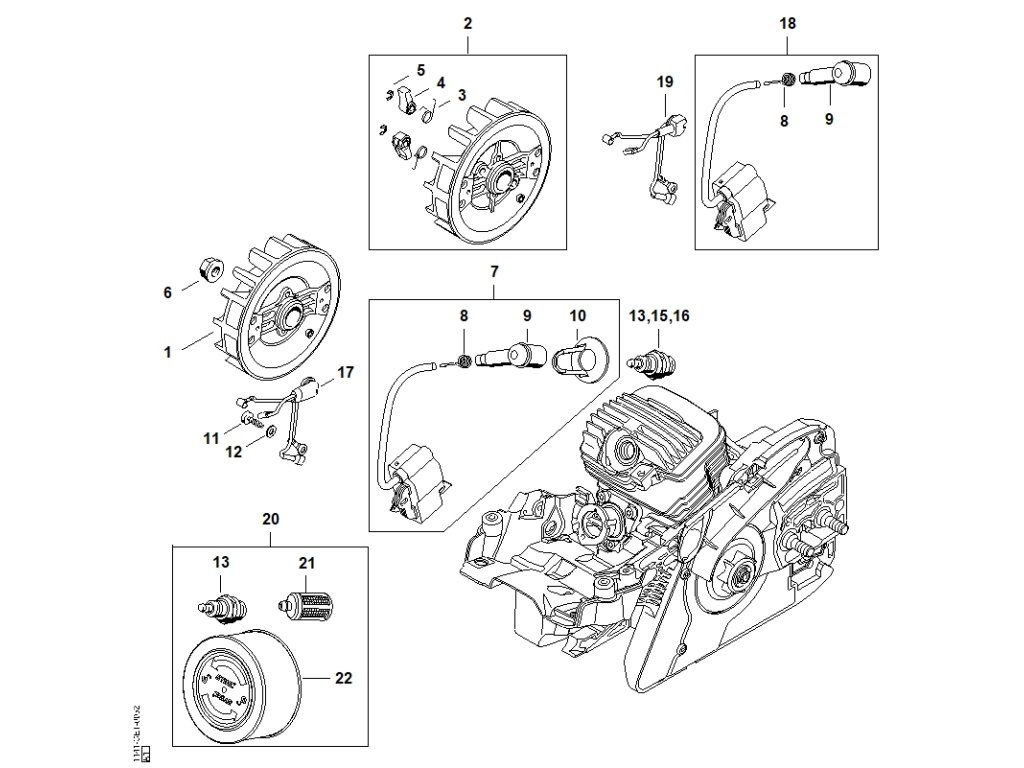 MS 271 / Zapaľovacia sústava, káblový zväzok / Náhradný diel číslo: 1, Zotrvačník