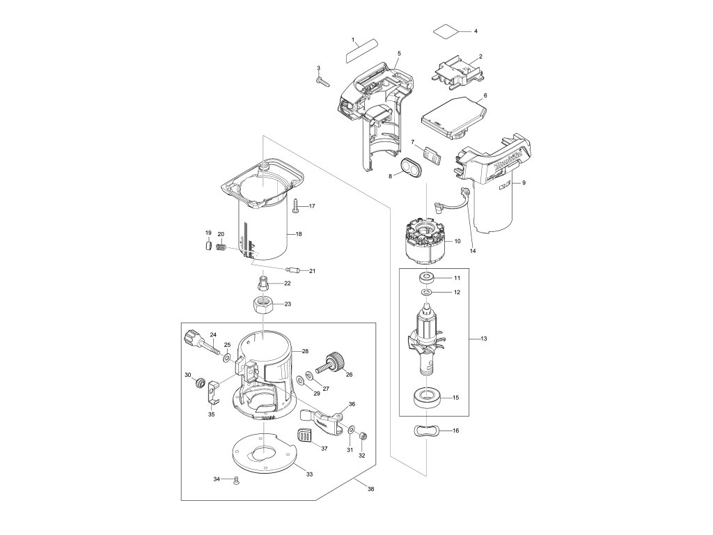 DRT50 / Náhradné diely Makita: 038 ZÁKLADŇA VODIACA RT0700C/DRT50
