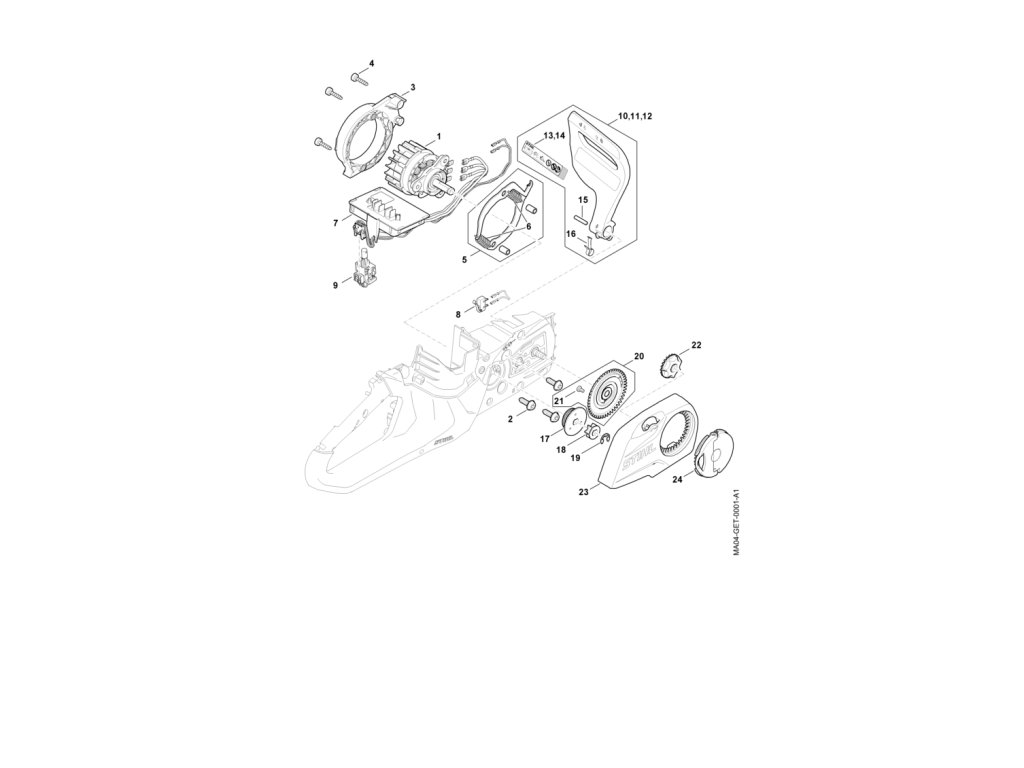 MSA 70.0 C-B / Elektromotor, elektronický modul, kryt reťazového kolesa / Náhradný diel číslo: 10, Ochrana ruky, obsahuje diely č.: 15,16