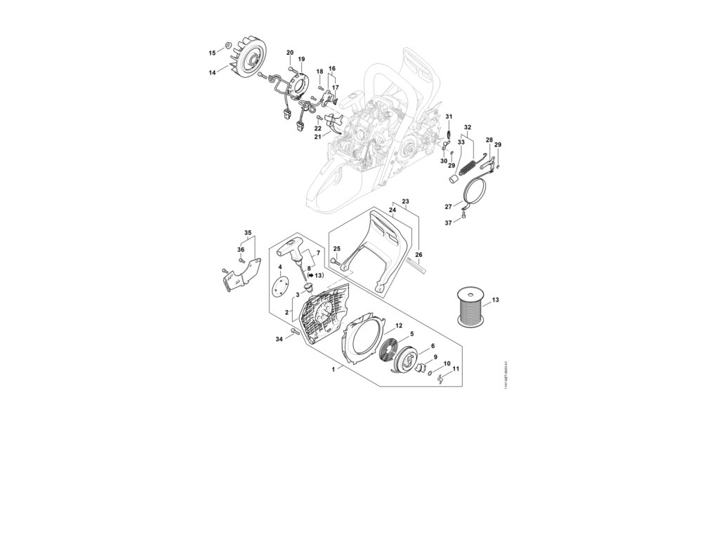 MS 500i / G - zapaľovacia sústava, kryt ventilátora / Náhradný diel číslo: 1, Kryt ventilátora so štartérom prevíjania, obsahuje diely č.: 2,3,4,5,6,7,8,9,10,11,12