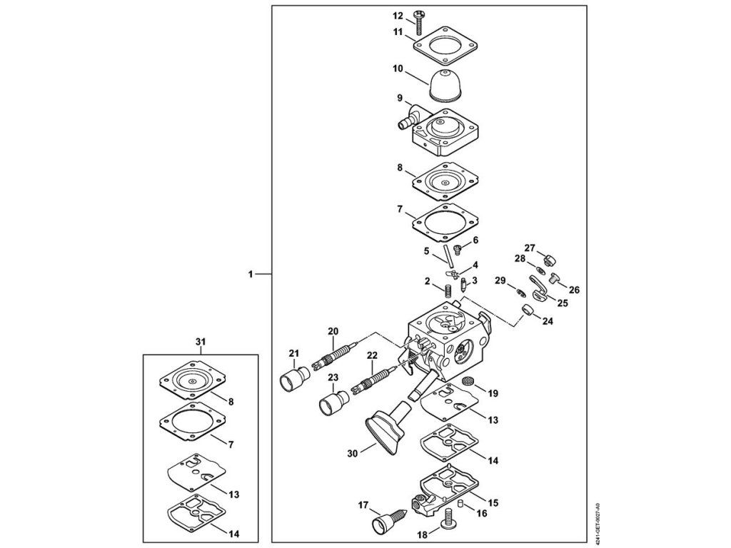 BR 200 / J - karburátor 4241/19 (037.2018) / Náhradný diel číslo: 31, Súprava dielov karburátora, obsahuje diely č.: 7,8,13,14
