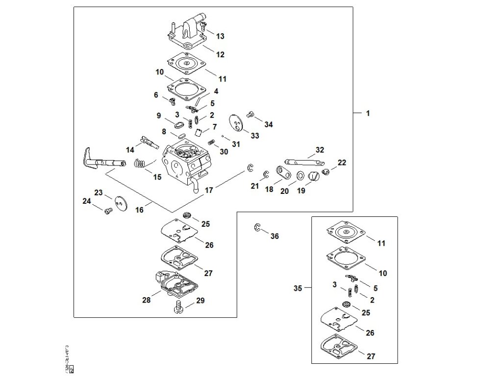 FS 450 / J - karburátor c1q-s34 (46.2003) / Náhradný diel číslo: 35, Súprava dielov karburátora, obsahuje diely č.: 2,3,5,10,11,25,26,27