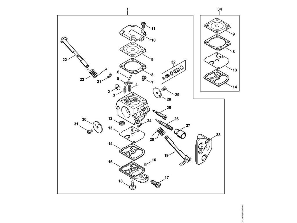 Ms 200 t / Karburátor c1q-s126 / Náhradný diel číslo: 34, Súprava dielov karburátora, obsahuje diely č.: 8,9,13,14