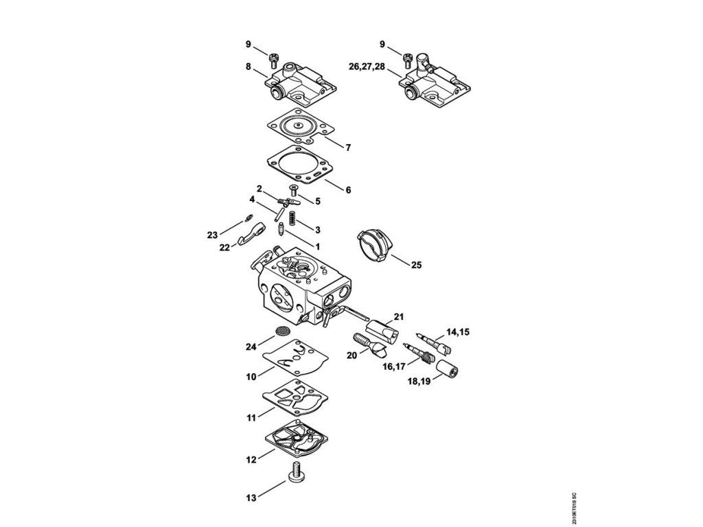 MS 251 / Karburátor wtf-2, wtf-4, wtf-8, wtf-9 (54.2013) / Náhradný diel číslo: -1, Karburátor WTF-2A, obsahuje diely č.: 1,2,3,4,5,6,7,8,9,10,11,12,13,14,16,18,20,21,22,23,24,25