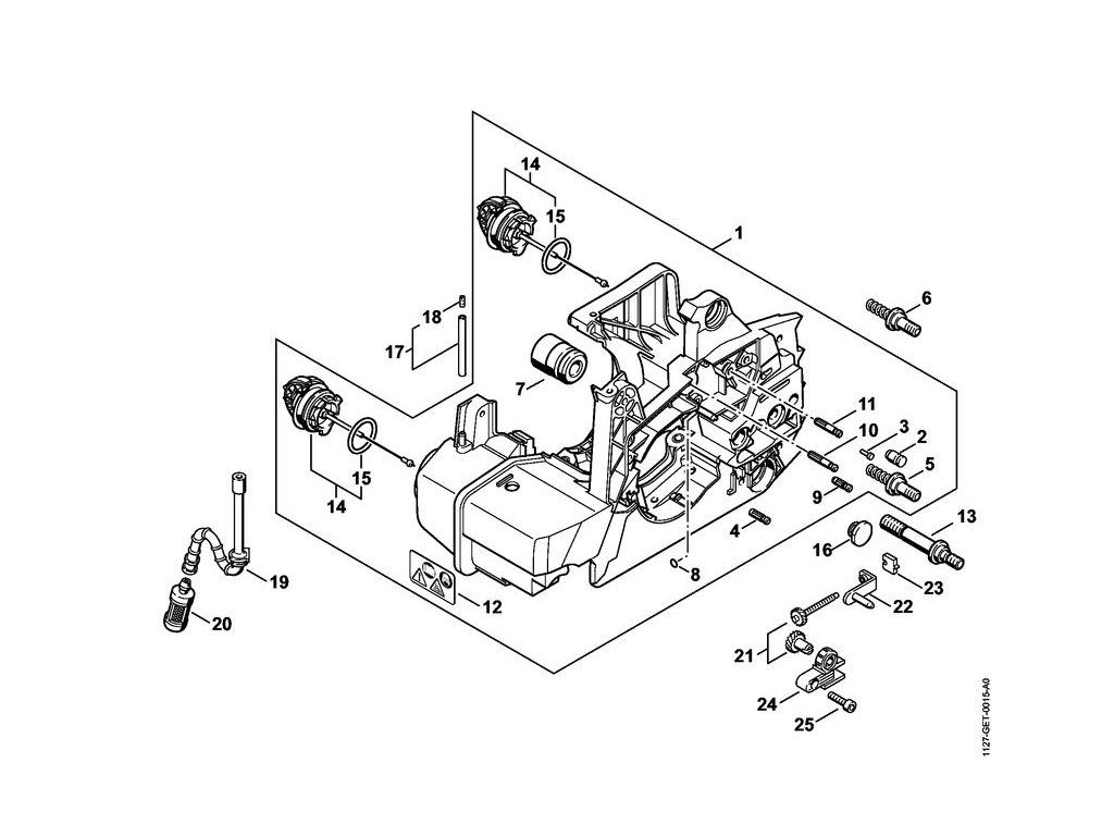 MS 390 / Kryt motora / Náhradný diel číslo: 14, Uzáver nádržky, obsahuje diely č.: 15