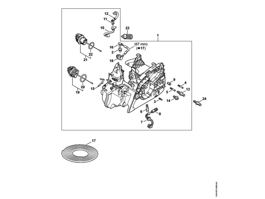 MS 211 / Kryt motora / Náhradný diel číslo: 1, Blok motora, obsahuje diely č.: 2,3,4,5,6,7,8,9,10,11,12,13,14,15,16,18,19,20,21,22