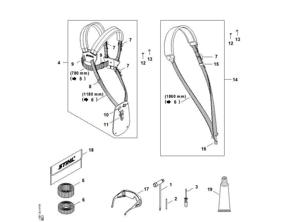 FS 130 / O - náradie, zvláštne príslušenstvo / Náhradný diel číslo: 14, Nosný popruh, obsahuje diely č.: 6,7,15,16