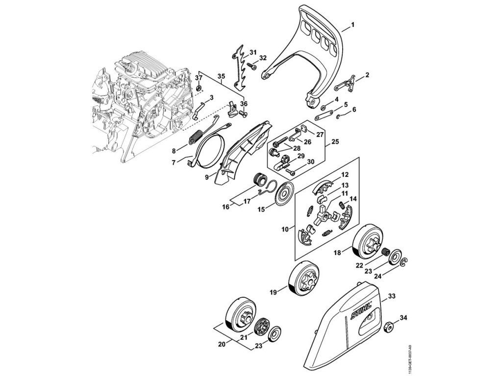 MS 211 / Ochrana ruky, reťazová brzda ms 211 / Náhradný diel číslo: 35, Zachytávač reťaze, obsahuje diely č.: 36,37