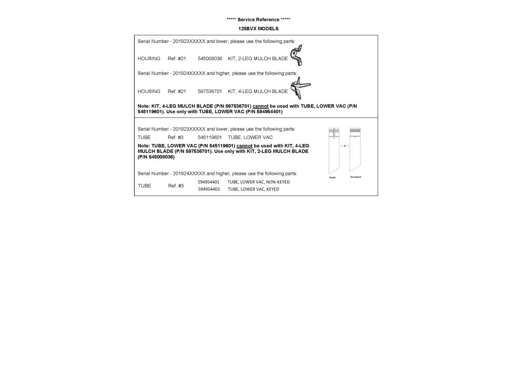 125BVx / Odkaz na servis / Náhradný diel číslo: 2, Rúra Sériové číslo - 201923XXXXX a nižšie, bez kľúča. Nepoužívať s 4-listovým obežným kolesom 597536701