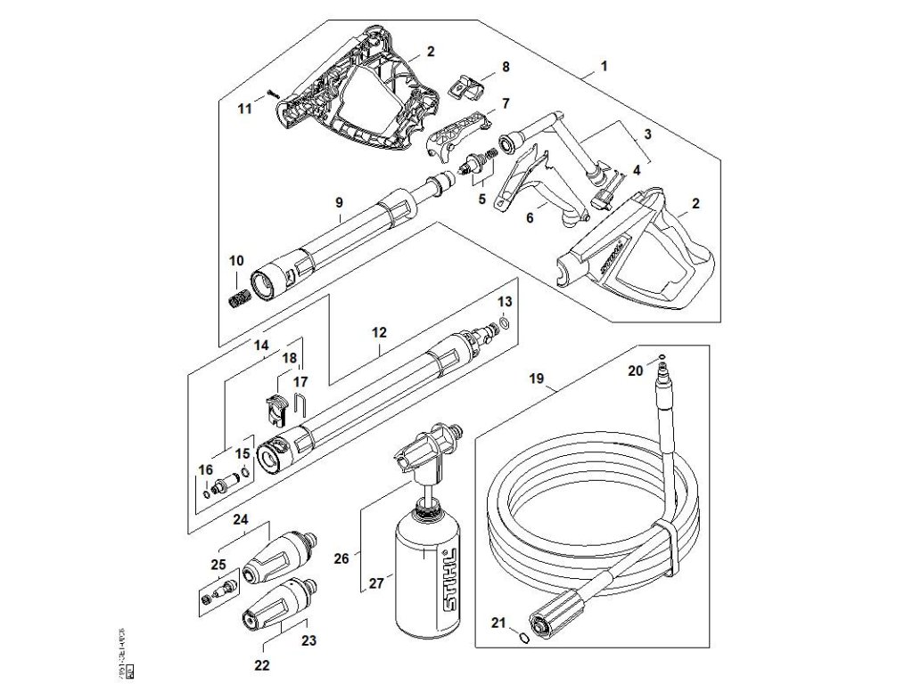 RE 90 4951 / Pištoľ, oceľová rúra / Náhradný diel číslo: 26, Postrekovacia súprava, obsahuje diely č.: 27