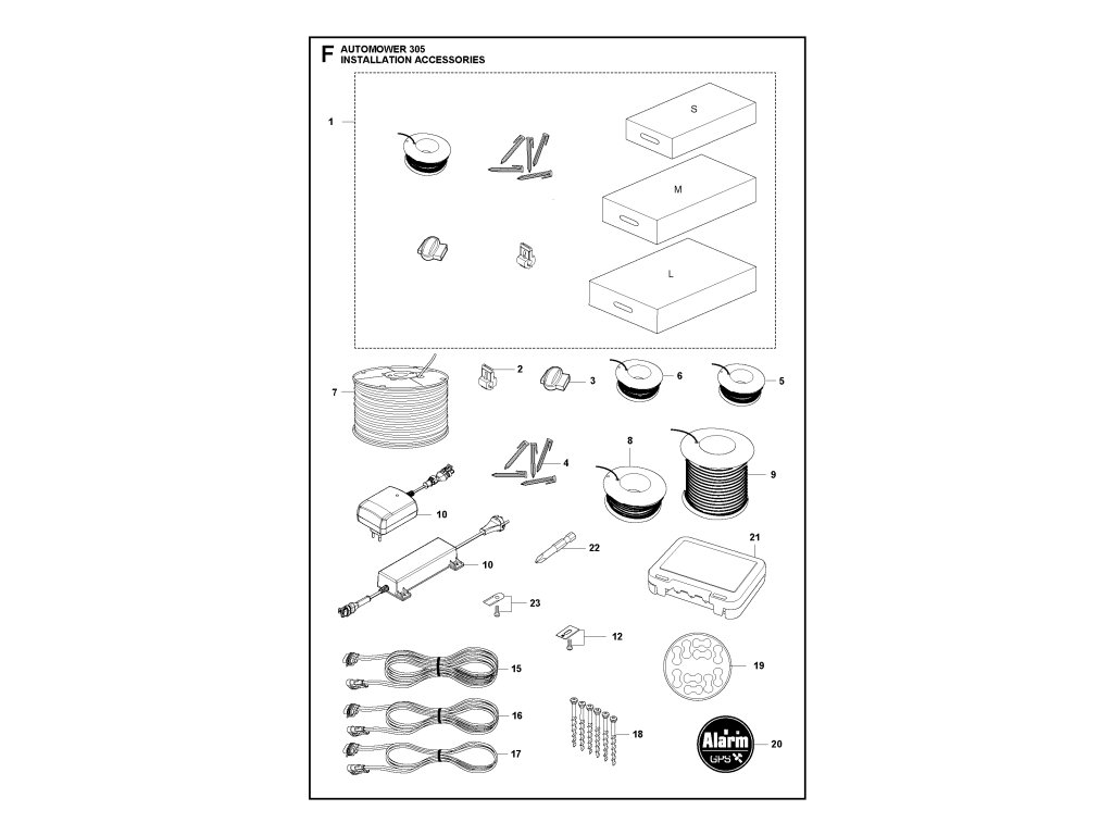 AUTOMOWER® 305 / Príslušenstvo pre montáž / Náhradný diel číslo: 1 967623601 Sada na inštaláciu s drôtom 150 m, sponami 300 ks, konektormi 3 ks, spojkami 5 ks