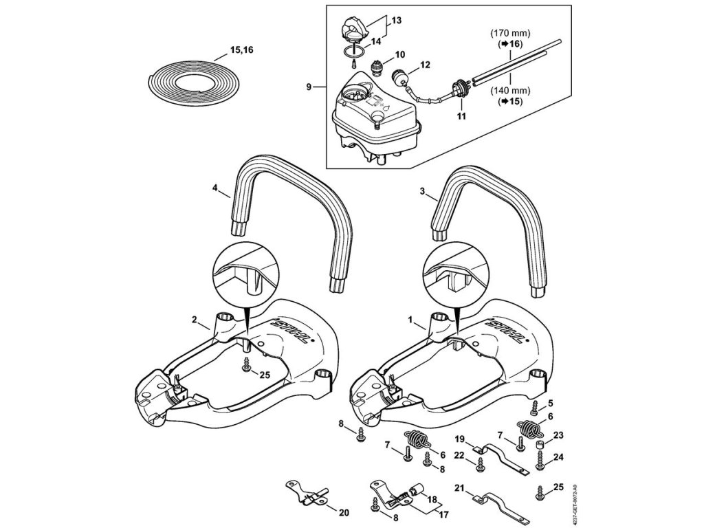 HS 82 R / Rám rukoväte, palivová nádrž / Náhradný diel číslo: 9, Palivová nádržka, obsahuje diely č.: 10,11,12,13,14,15,16