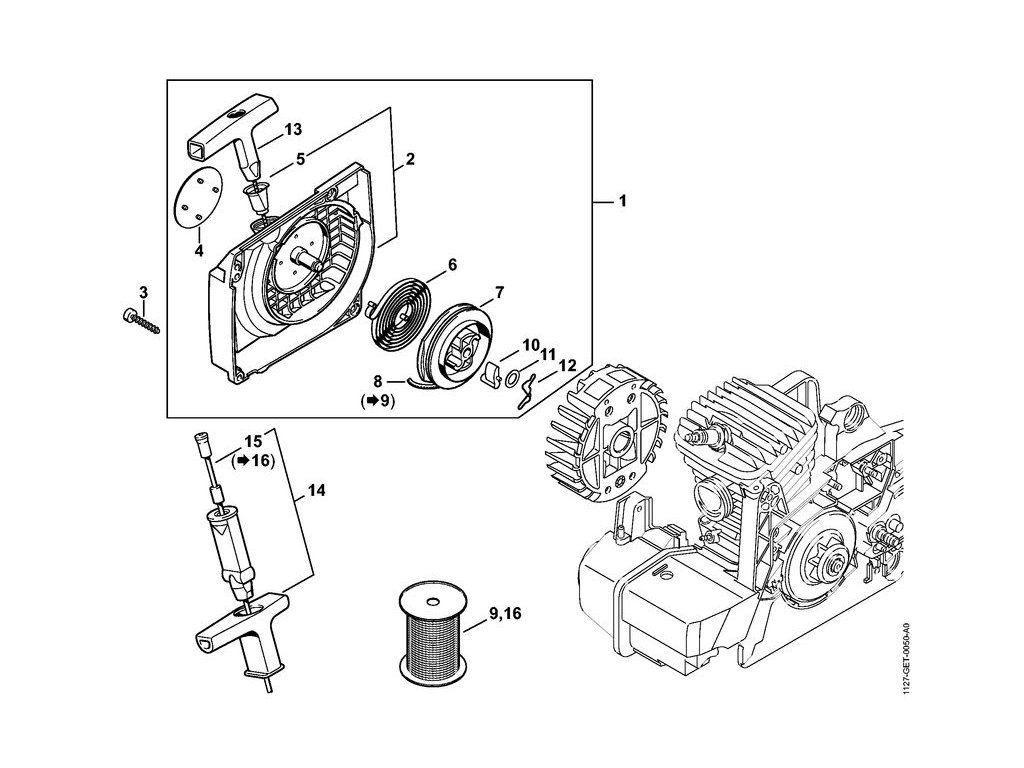 MS 390 / Teleso ventilátora so štartovacím zariadením / Náhradný diel číslo: 15, Štartovacie lanko