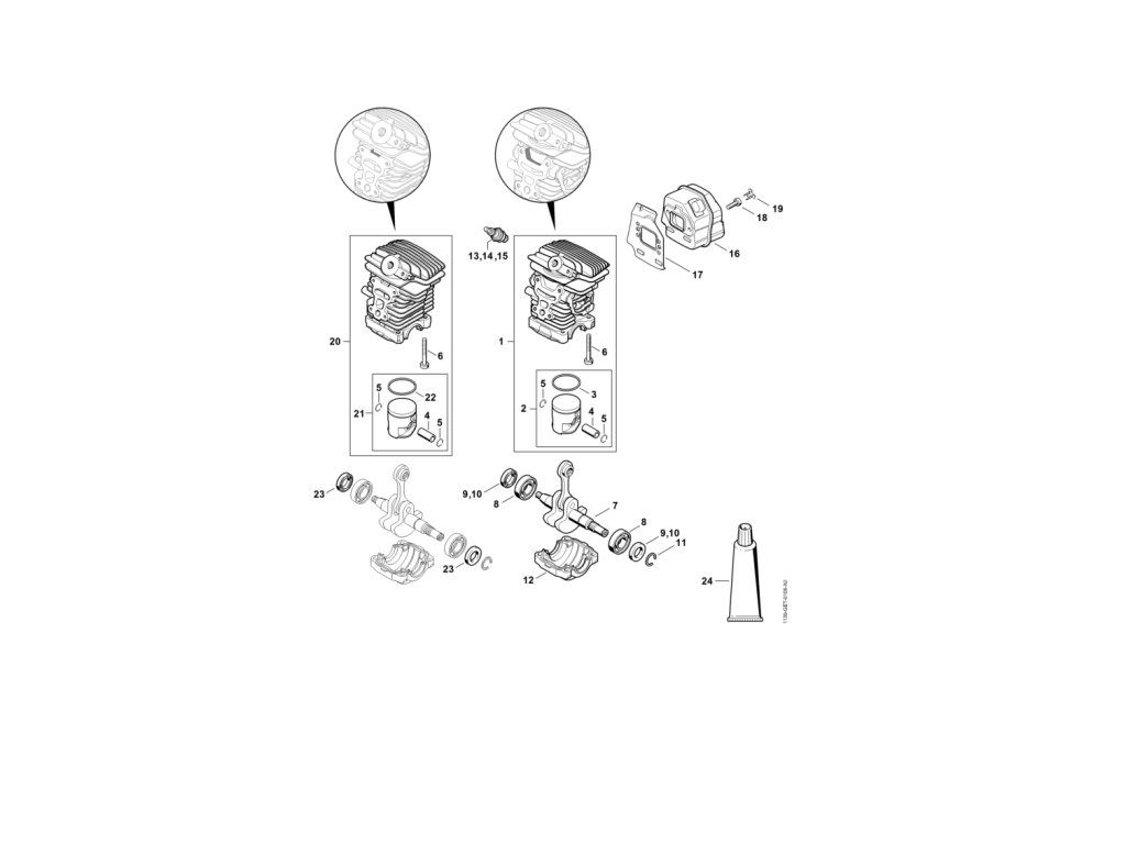 MS 211 / Valec, tlmič výfuku / Náhradný diel číslo: 20, Valec s piestom Ø 40 mm, obsahuje diely č.: 4,5,6,21,22